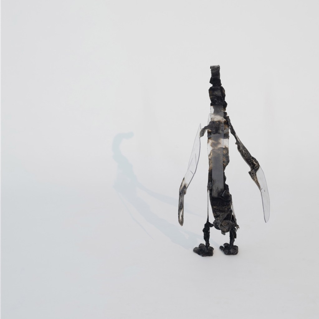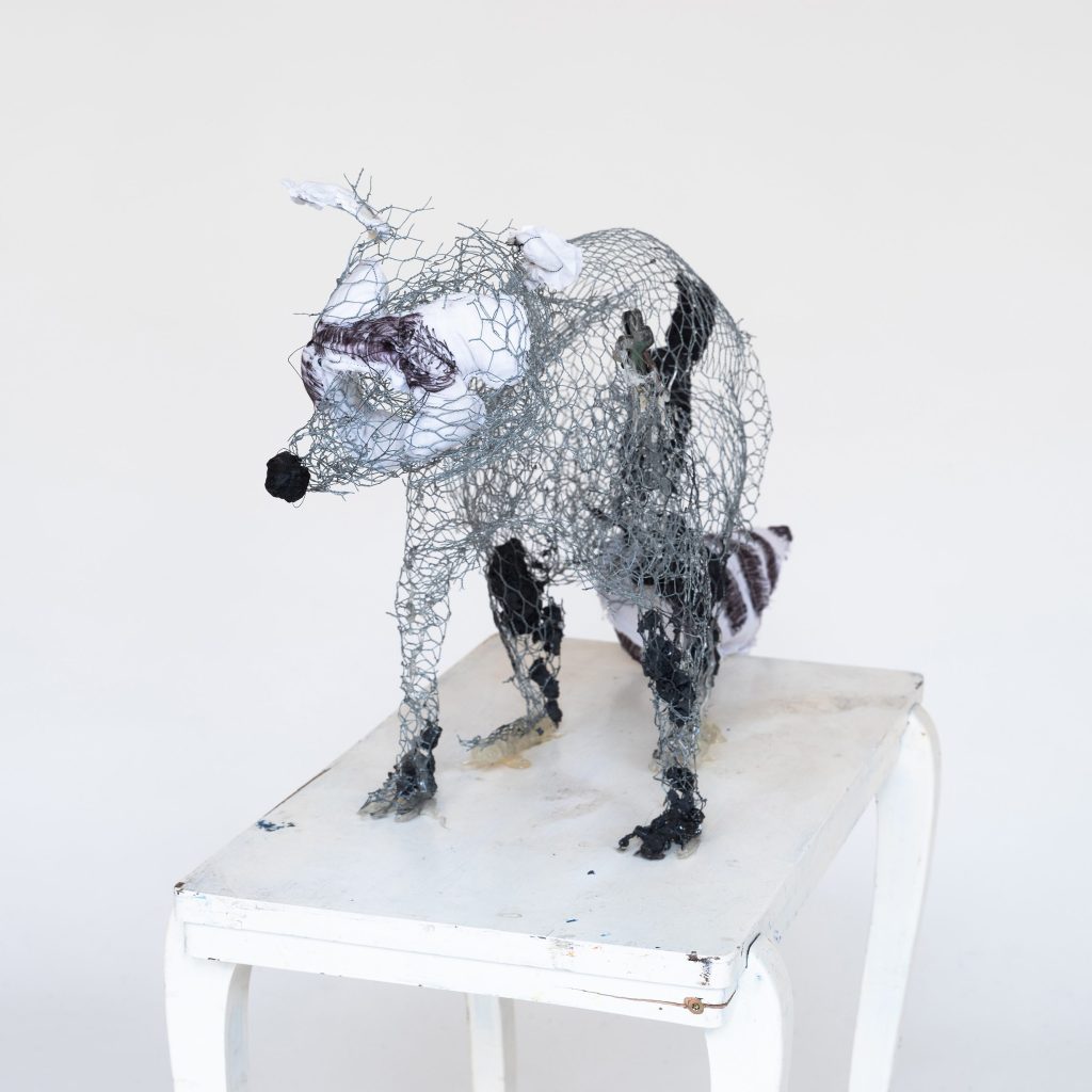 Chicken wire, bedsheet, fabric pen, resin.